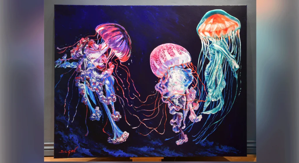 Ce qui distingue immédiatement les œuvres de Michel Degav, c’est sa maîtrise de la peinture au couteau (ou au couteau de palette). Là où d’autres utilisent le pinceau, Michel Degav applique la couleur directement sur la toile avec une spatule, créant des textures en relief, des effets de matière et une profondeur visuelle qui donnent à ses tableaux une présence presque tactile.